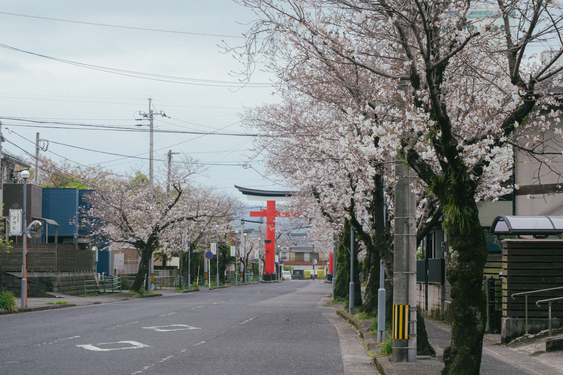 神宮前の参道では、赤い鳥居と桜並木のコントラストが美しく、写真撮影スポットとしても人気があります📸