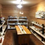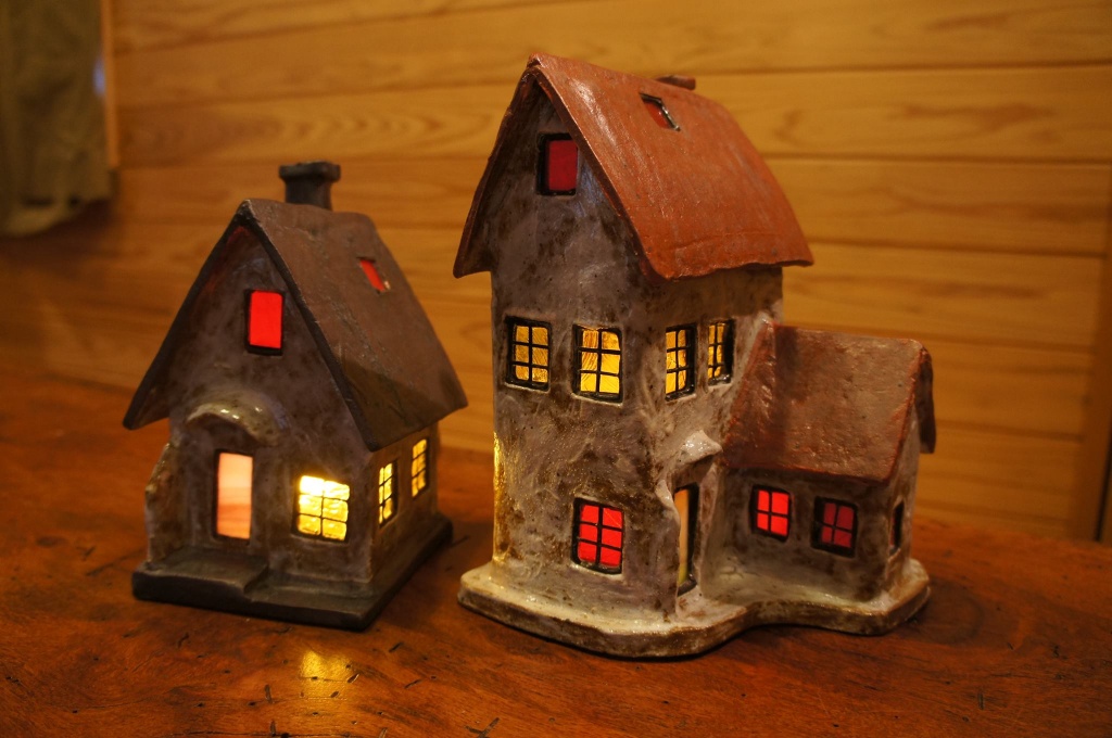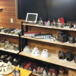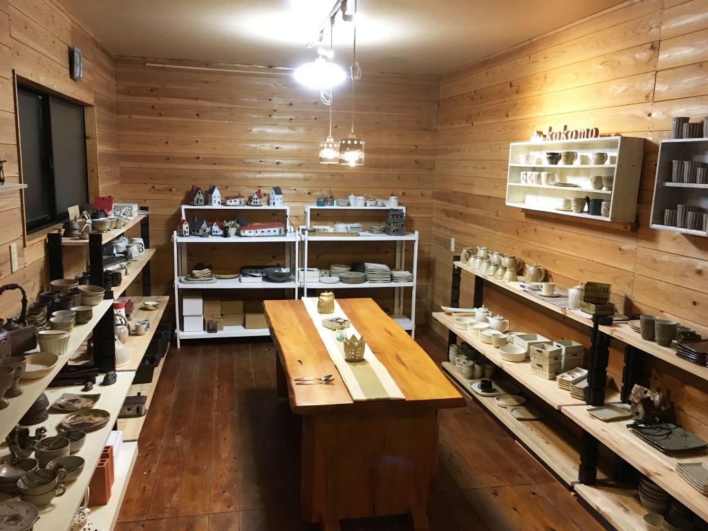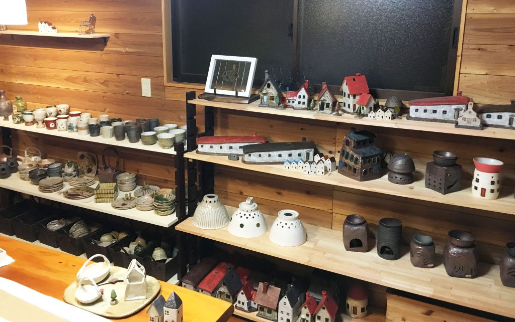 Handmade pottery, lampshades, objet d'art, and stained glass objects from the adjacent studio, Akari Gama, are available for sale.