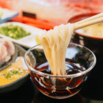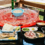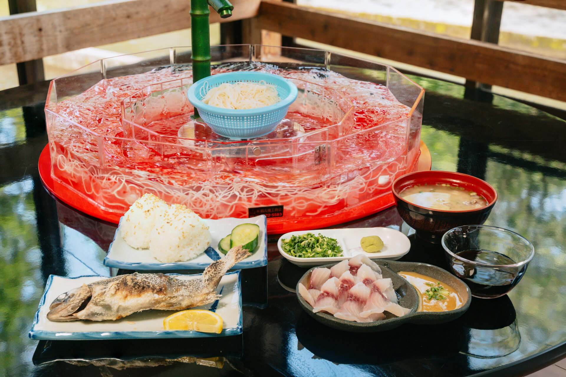 大きな生け簀には、コイやマス、そして珍しいチョウザメが悠々と泳いでおり、その様子を眺めながらの食事は特別なひととき。そうめん流しはもちろん鹿児島スタイルで、テーブルの上をぐるぐる回る“回転式そうめん流し”です。テーブルを囲んでワイワイ楽しめるのも魅力のひとつ。