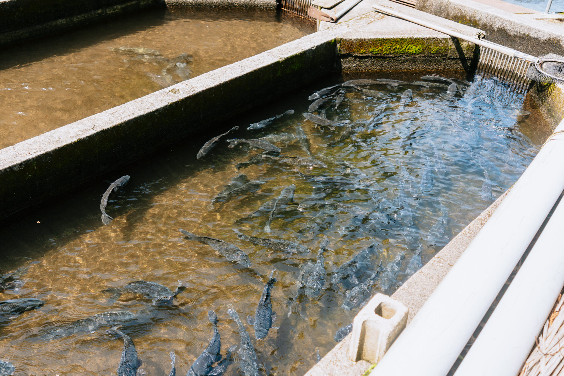 竹川峡の料理がおいしい理由のひとつが“水”。日本の滝百選にも選ばれた「龍門滝」を流れる網掛川の上流から引いた天然水を使用しており、生け簀にもその清流を使っています。この澄んだ水が、クセのない美味しい川魚を育てる秘密でもあります。