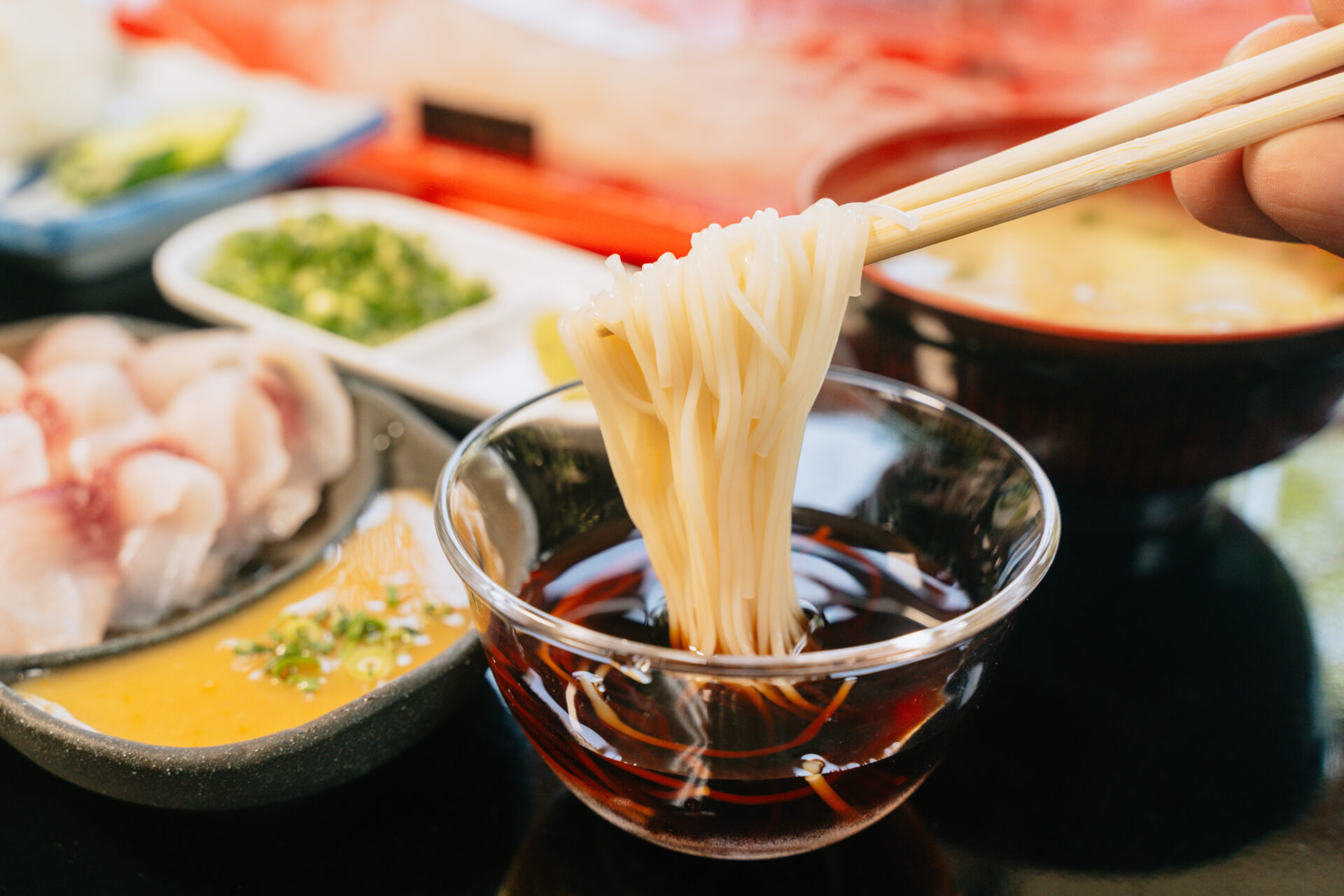 中でも一番人気は「そうめん定食B」。たっぷり2把のそうめんに、マスの塩焼き、鯉こく(鯉の味噌汁)、鯉のあらい(自家製酢味噌付き)、おにぎりがセットになった、ボリューム満点の内容です。鯉のあらいはコリコリとした歯ごたえで、自家製の酢味噌との相性も抜群。