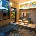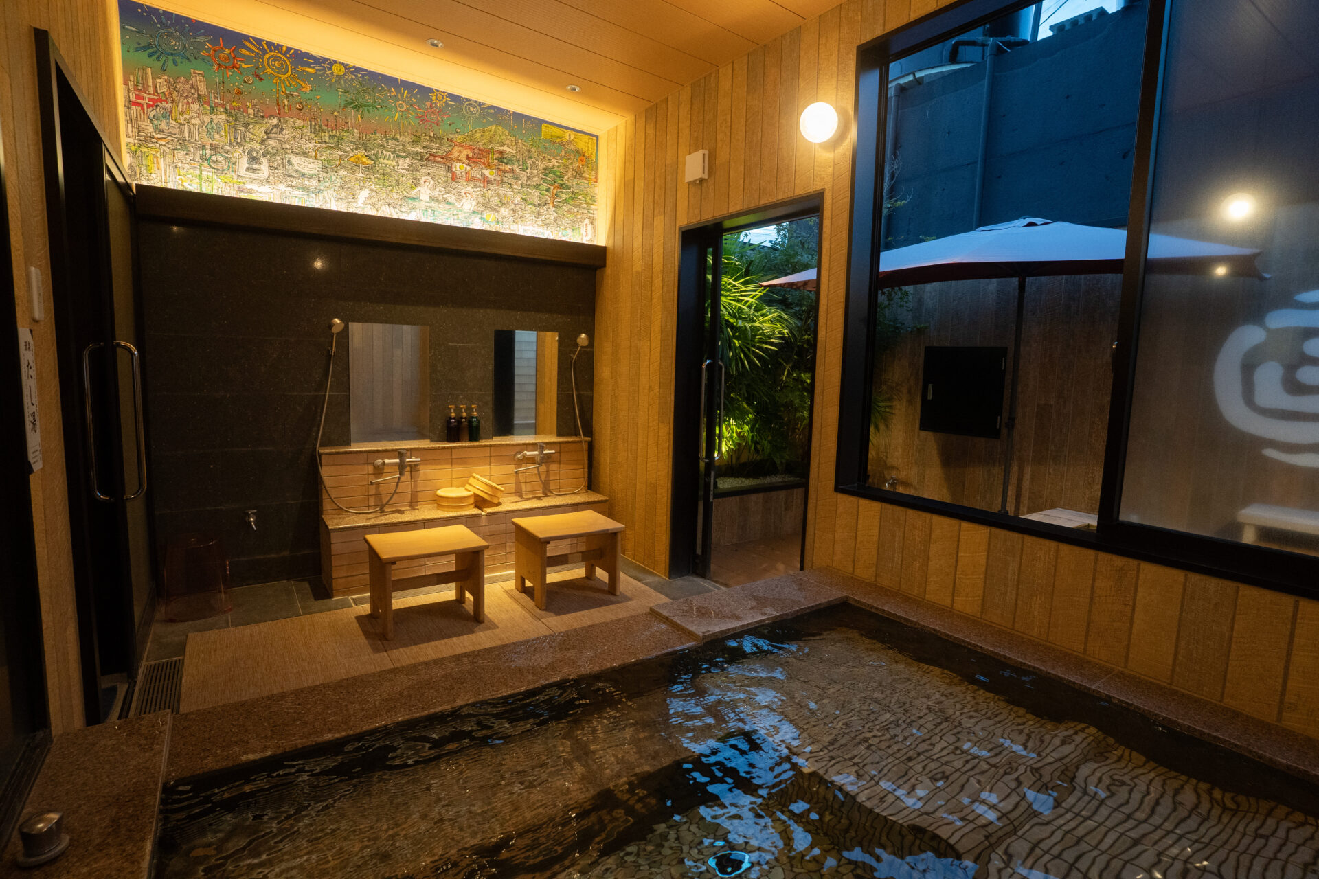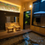 日当山温泉郷にある貸切家族湯「家族湯一番 えにし」は、日本神話をテーマにした全2室の贅沢な温泉施設。お部屋の名前は「イザナミの湯」と「イザナギの湯」。それぞれに鹿児島在住のイラストレーターによる神話モチーフの壁画が描かれており、広々とした内湯と開放的な露天風呂で、物語の世界に包まれながらゆったりと湯浴みが楽しめます。