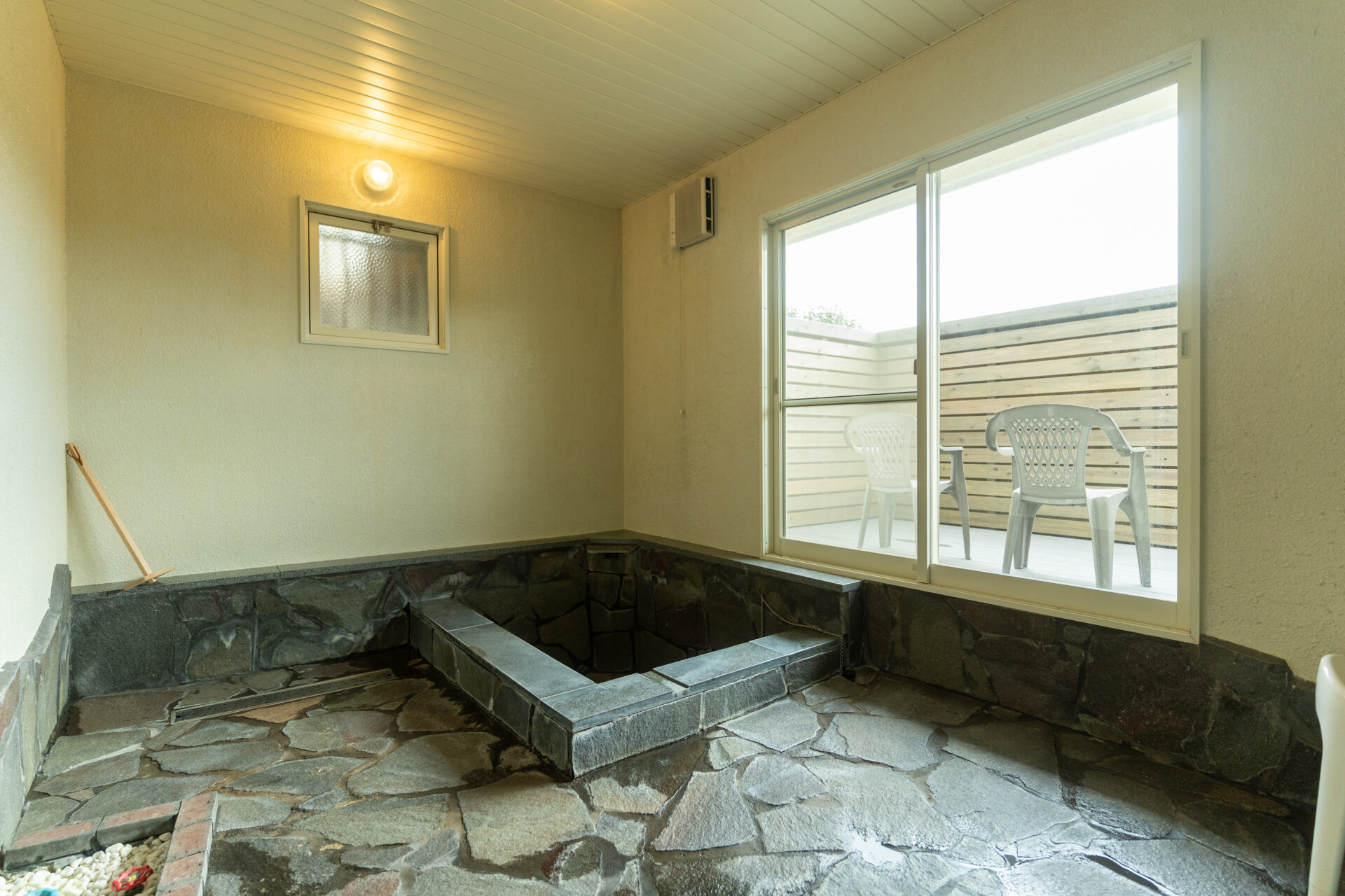 温泉付きのバスルームでは、プライベートな空間で心ゆくまで湯浴みを満喫。ウッドデッキからは霧島の自然を望み、夜には満天の星空を眺めながら癒しのひとときをお過ごしいただけます。