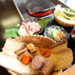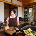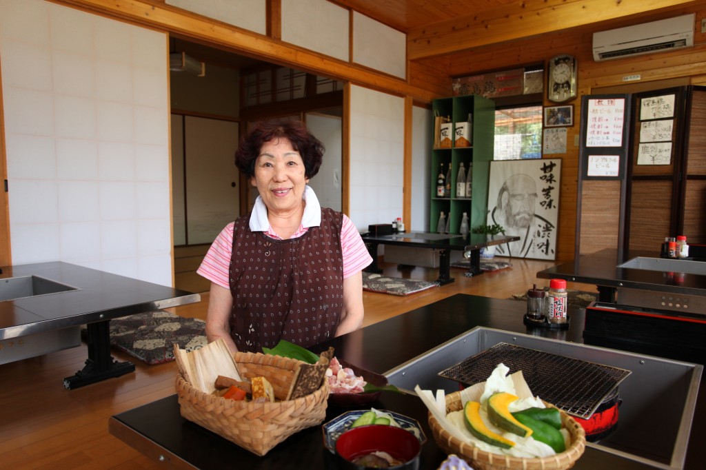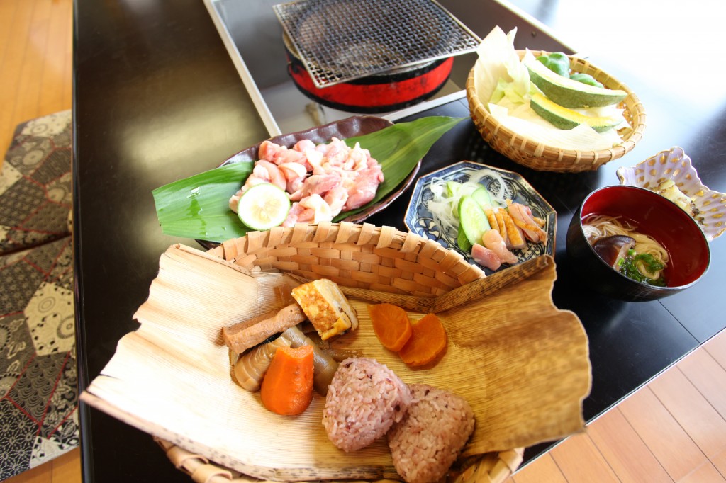 人気の霧島鶏ランチは、鶏の炭火焼き、野菜、そうめん、おにぎり、煮しめ、漬物、黒酢ドリンクが付いて1200円。プラス400円で鶏のたたきも付いてきます。