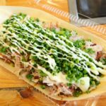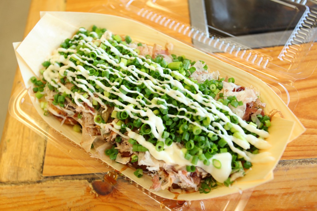 アツアツの美味しいたこ焼きはいかが?写真はネギがたっぷりかかったネギタコやき(450円)。フワフワの生地にくるまれた柔らかいタコ!ソースとの相性抜群で食べるとクセになります。