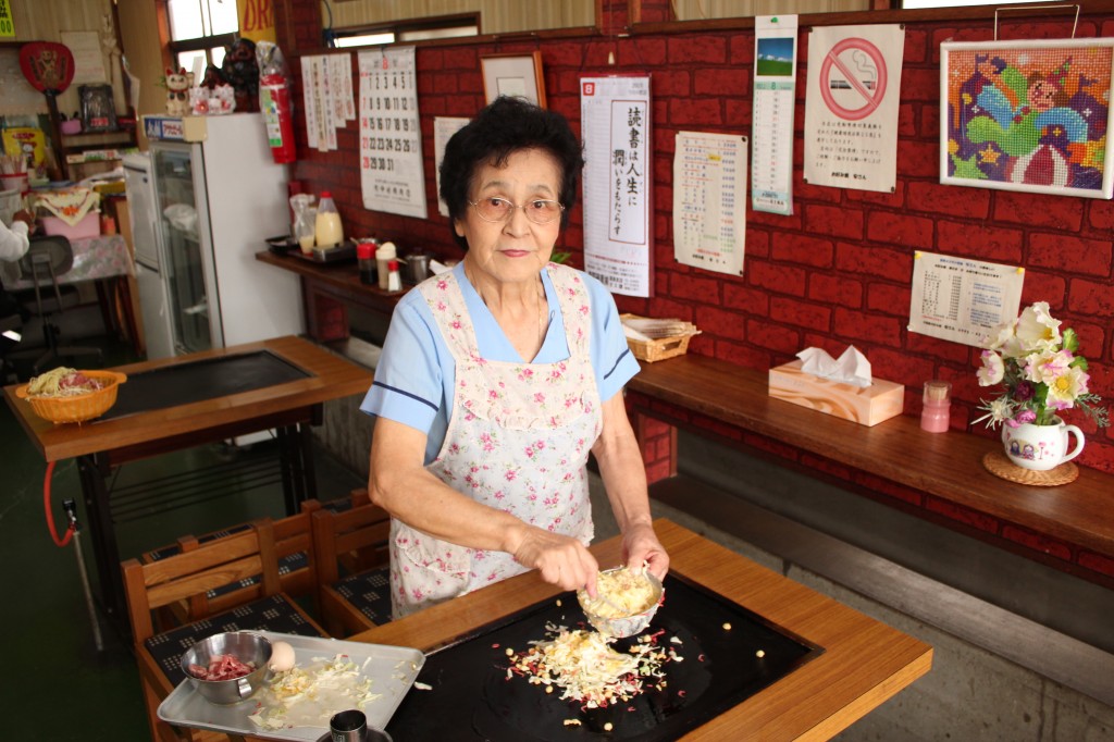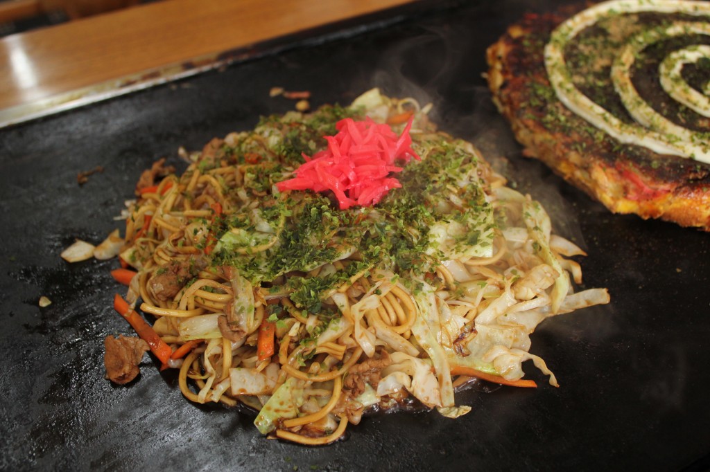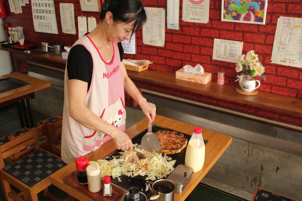 写真のお好み焼きは卵5個、ニンニク、エビ、イカ、豚肉がたっぷり入った、その名も「天下一」!食べると天下を取った気分になっちゃいます!?