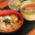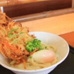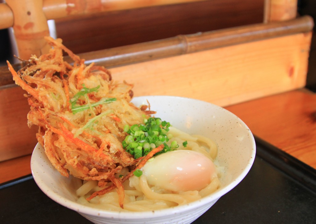 器からはみ出すほど大きいかき揚げの乗った「かきあげ釜玉480円」、うどんとサラダの付いてくる「かつ丼セット730円」と「からあげセット730円」は中でも人気のメニュー!