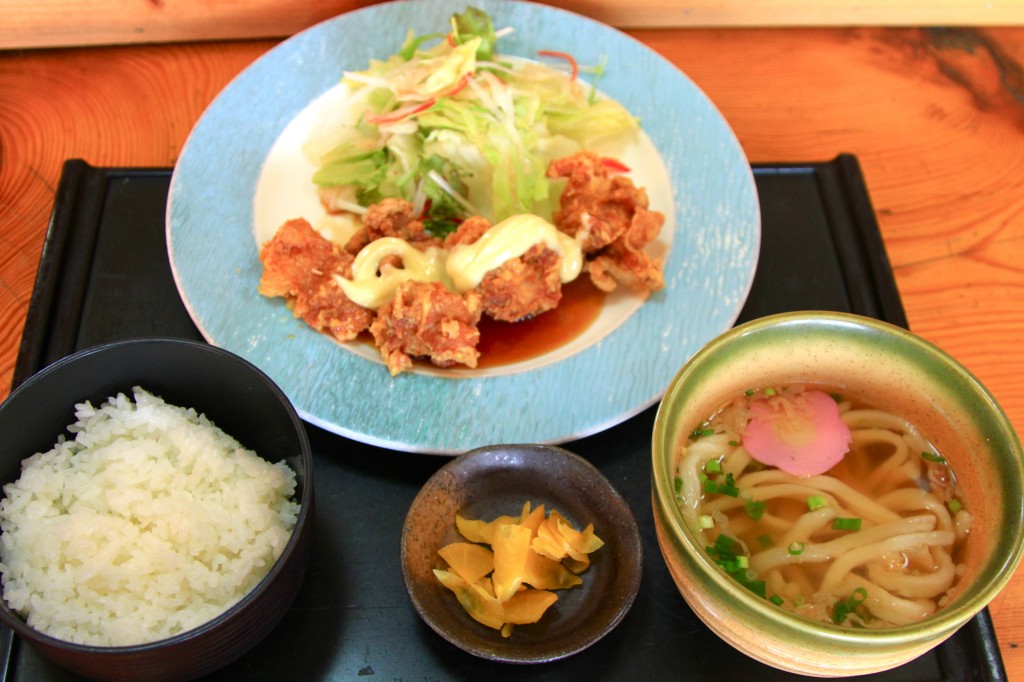 女性の方にも大人気のからあげセットはあっさりしたタレが揚げたてジューシーな唐揚げとナイスマッチング!うどんもコシがあり食べごたえ充分ですよ〜