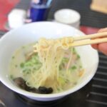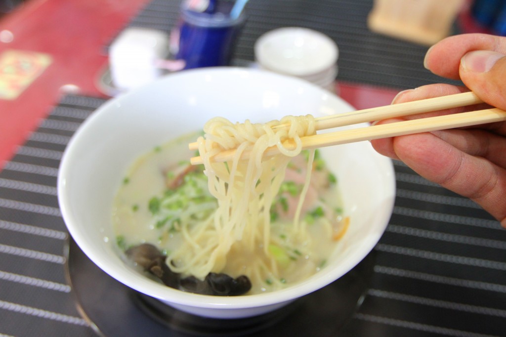 麺は福岡から仕入れています(ラー麦を使った細めんです)。黒豚とんこつ100%のスープは、黒豚骨・黒豚豚足をふんだんに使ったコラーゲン、カルシウムたっぷり!あっさりまろやかな真っ白なスープはインパクト大!