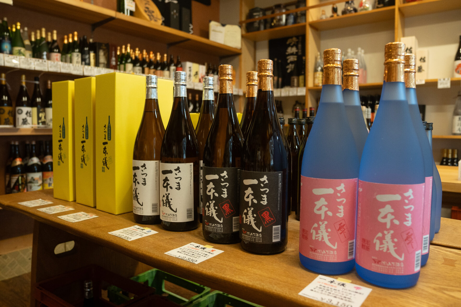 店内には、約80銘柄の焼酎がずらりと並び、中でもイチオシは山下酒店限定焼酎「さつま一本儀」。