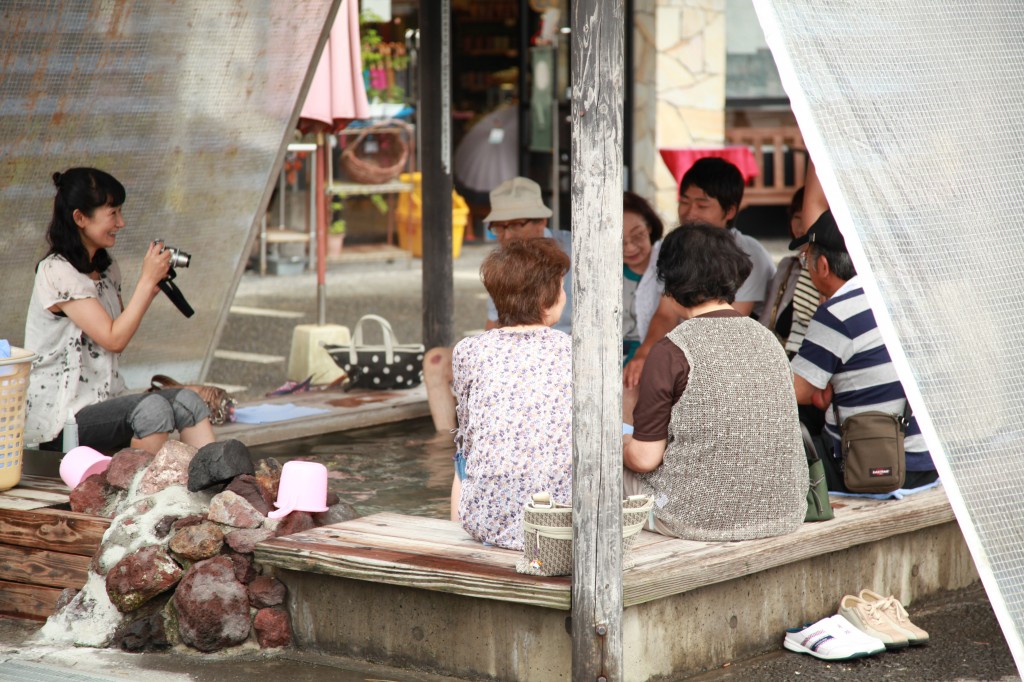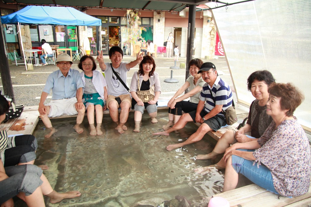 敷地内広場中央には屋根付の足湯がもうけられており、休日になると観光客で賑わい、順番待ちになるほど大人気です。