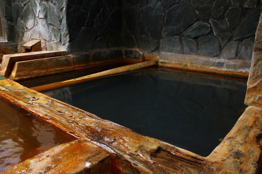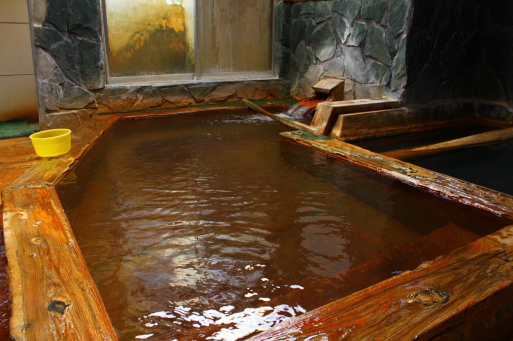 こちらの温泉は "ラムネ湯" と呼ばれる炭酸水素塩泉完全掛け流し。木製の浴槽に勢いよく注がれています。
