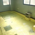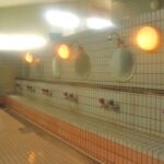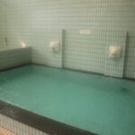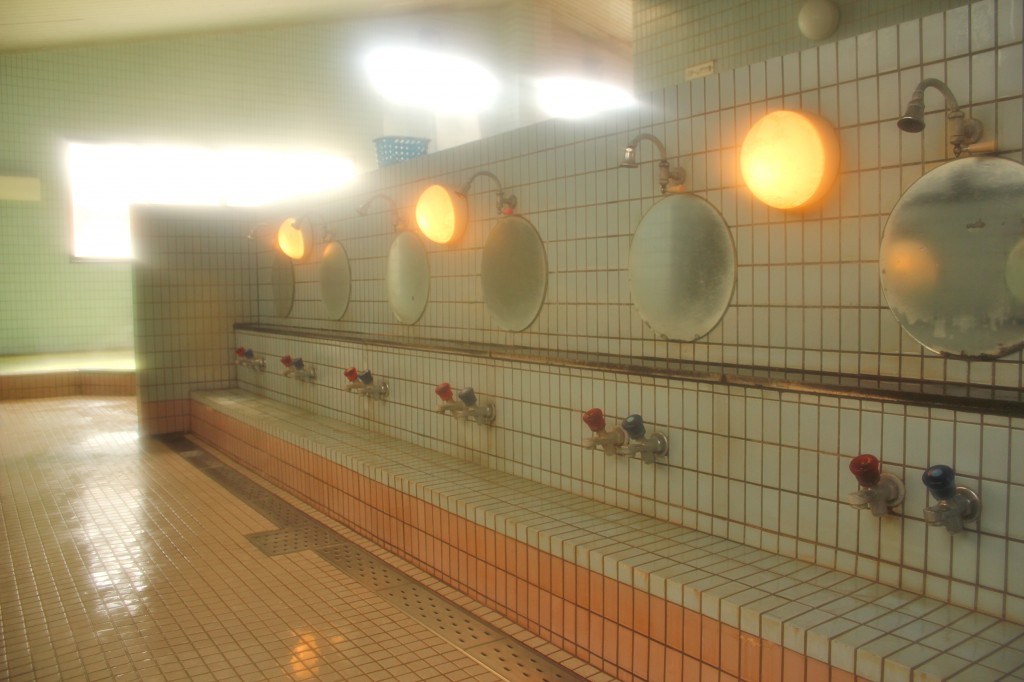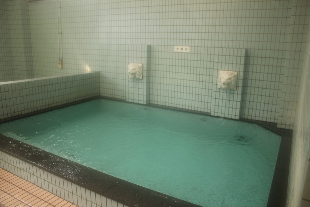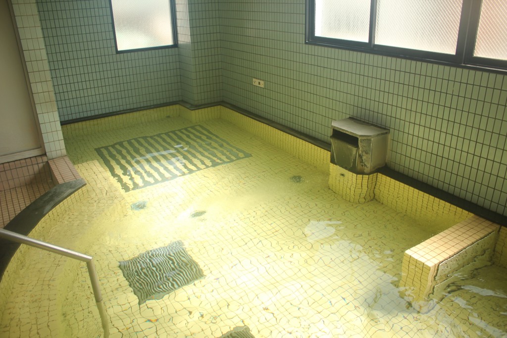 国分新町の住宅街の中にある「国分温泉」。全面タイル張りで造られた浴室には、広々とした浴槽が二つと、打たせ湯があります。