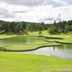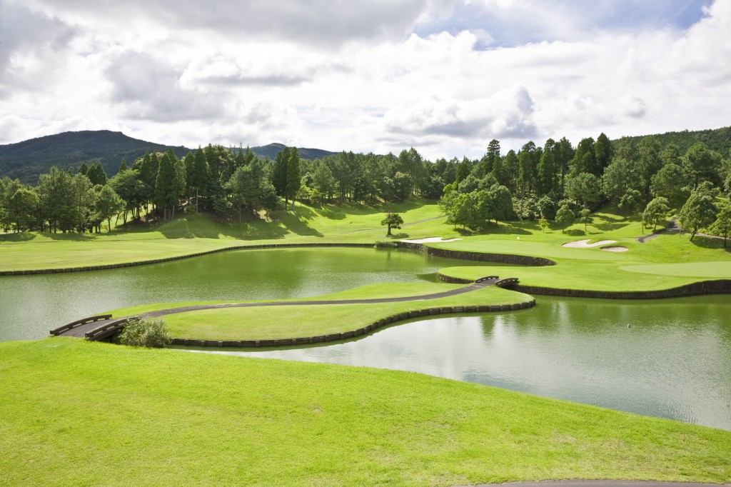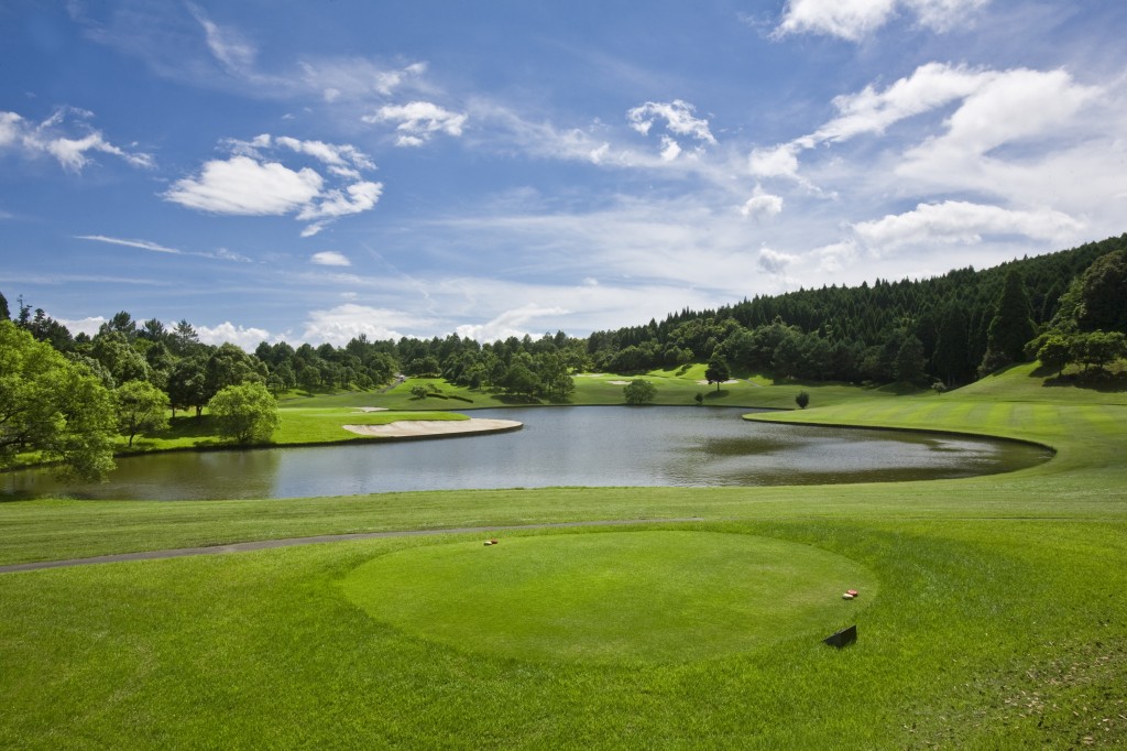 インの中盤から後半は、正面に霧島連山や桜島を望むホールが続く。7番ホールはグリーンの縁まで池がめぐらされた美しい名物ホール!