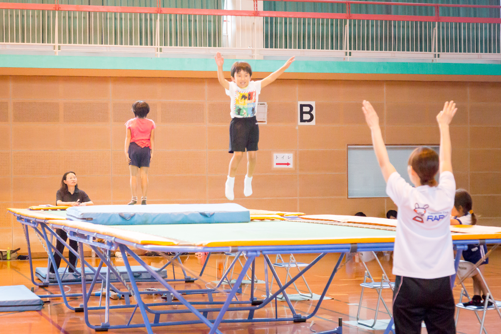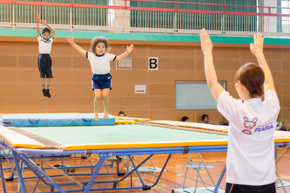 トランポリンクラブRARAでは、トランポリンを通しての子供さんの空中感覚をはじめとする運動能力の育成と向上、大人の生徒さんに対してはトランポリンによる、全身運動を楽しみながらの健康維持を計ることを目的としています。