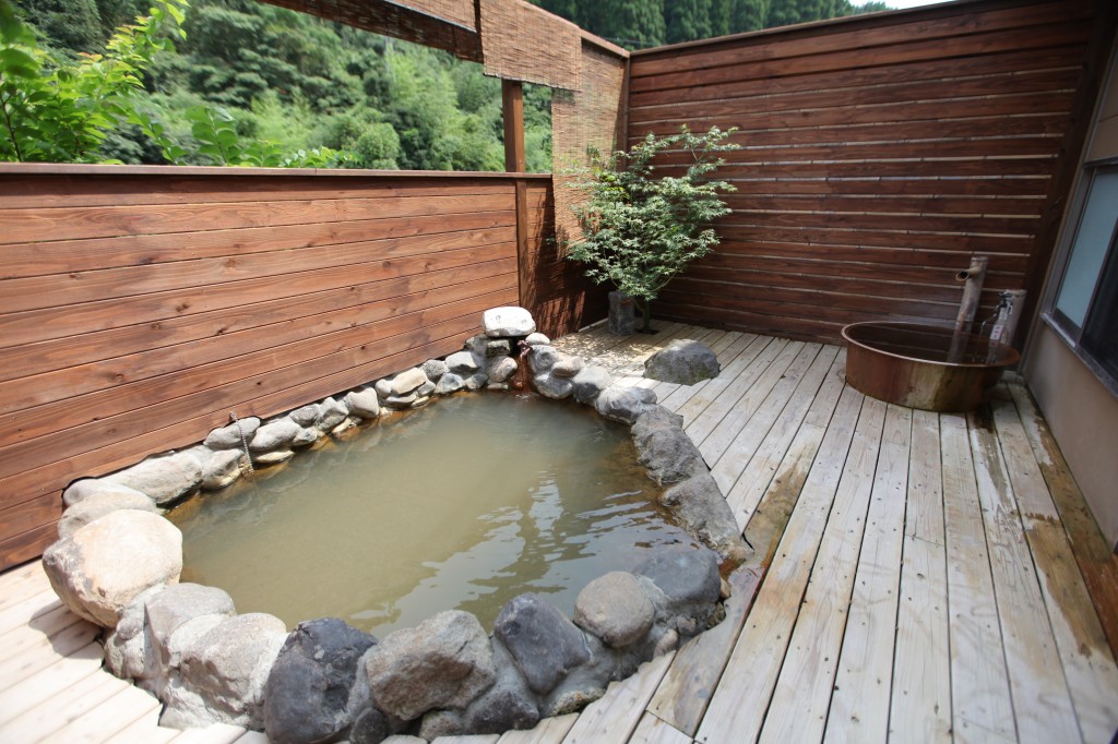 2011年5月にオープンした、貸切家族湯「季一湯」。全室、内湯と天隆川に面した露天風呂が付いた贅沢な造りとなっております。