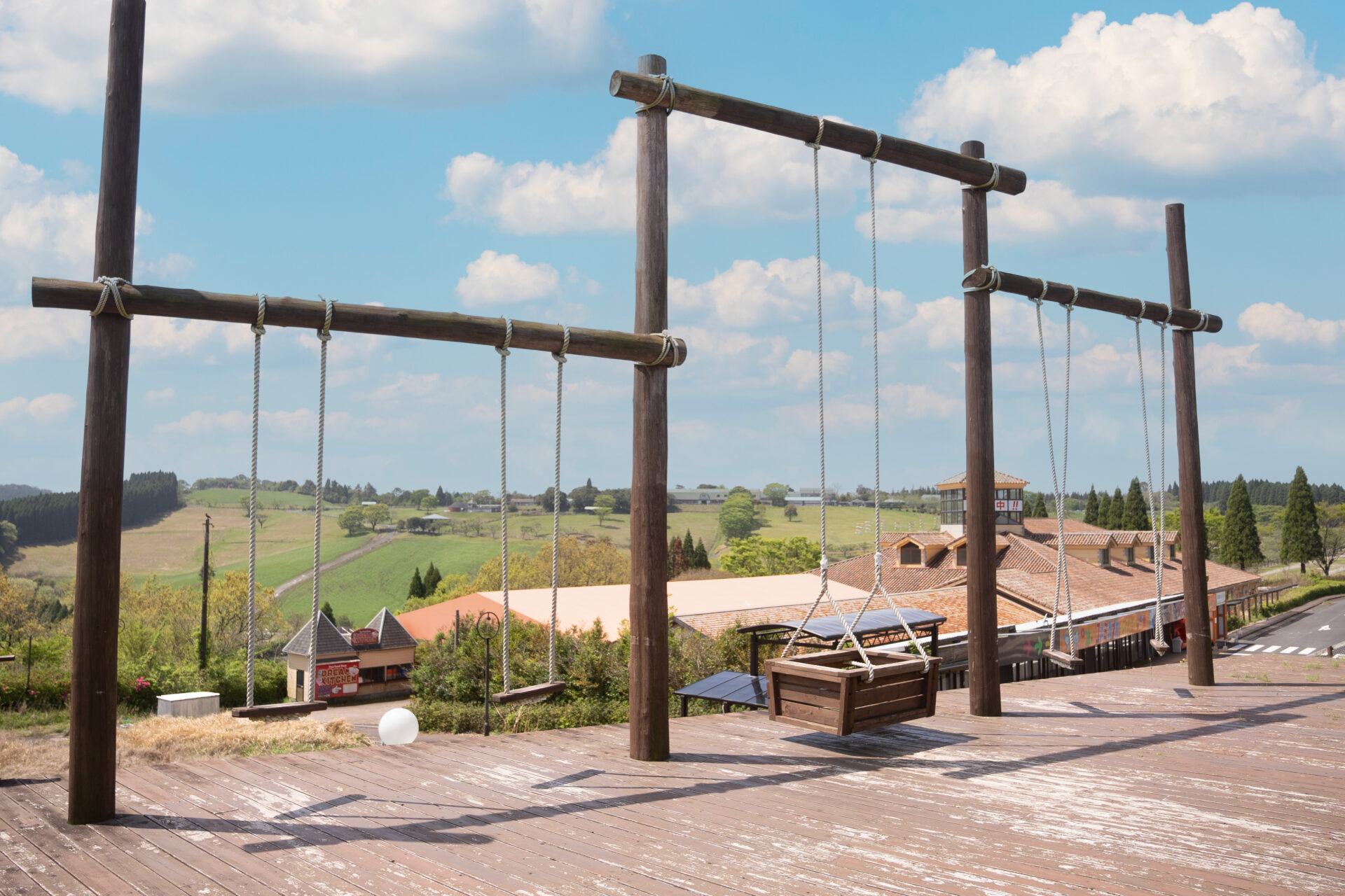 保護者の方も安心して見守れる観覧デッキや、屋外の大きなブランコ、霧島の天然水を使ったプールもあり、家族でゆったり楽しめます。